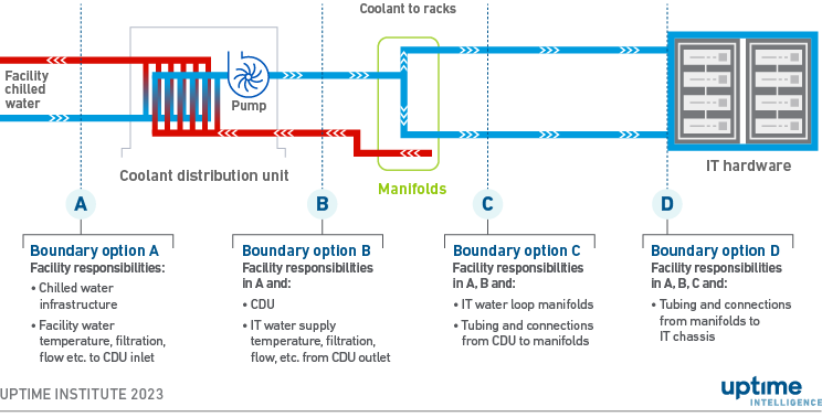 Figure 1. Vertiv™ Facility and IT boundary responsibility options for a DLC system. Source: Uptime Institute, 2023