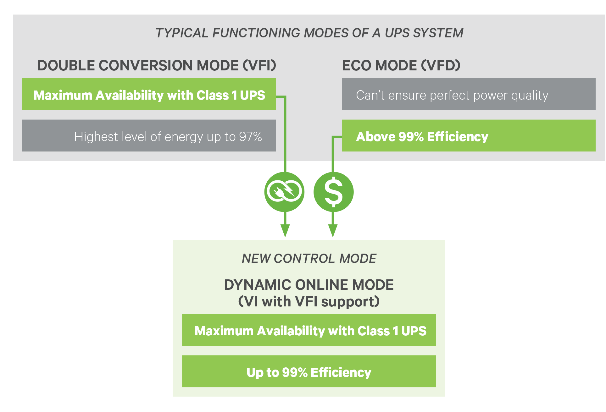 • Up to 99% operating efficiency in Dynamic Online mode, maximizing energy usage and minimizing losses, while still securing the critical load against grid events within IEC 62040-3 Class 1 limits.