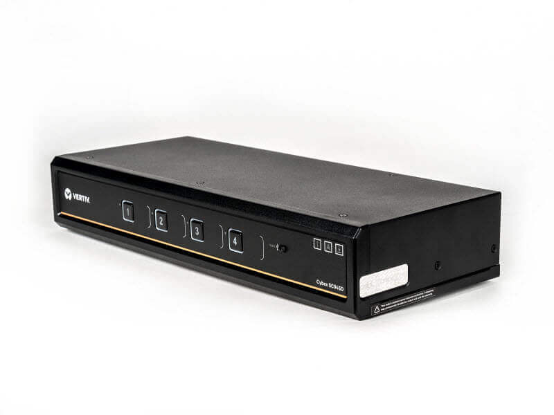 The Cybex™ SC945D secure desktop KVM is designed to meet the stringent specifications of the U.S. government and certified to the NIAP / Common Criteria Protection Profile for Peripheral Sharing Switch version 3.0.