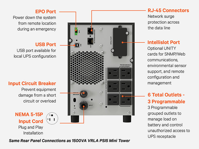 The Vertiv™ Liebert® PSI5 Lithium-Ion uninterruptible power supply (UPS) is designed to safeguard critical equipment in edge and distributed IT applications. This 1500VA Mini Tower UPS offers more than double the battery life of a traditional VLRA UPS, and comes with a five-year advanced replacement warranty. This Lithium-Ion battery backup also includes automatic voltage regulation (AVR) technology to further extend battery life and provides premium protection from power disturbances.