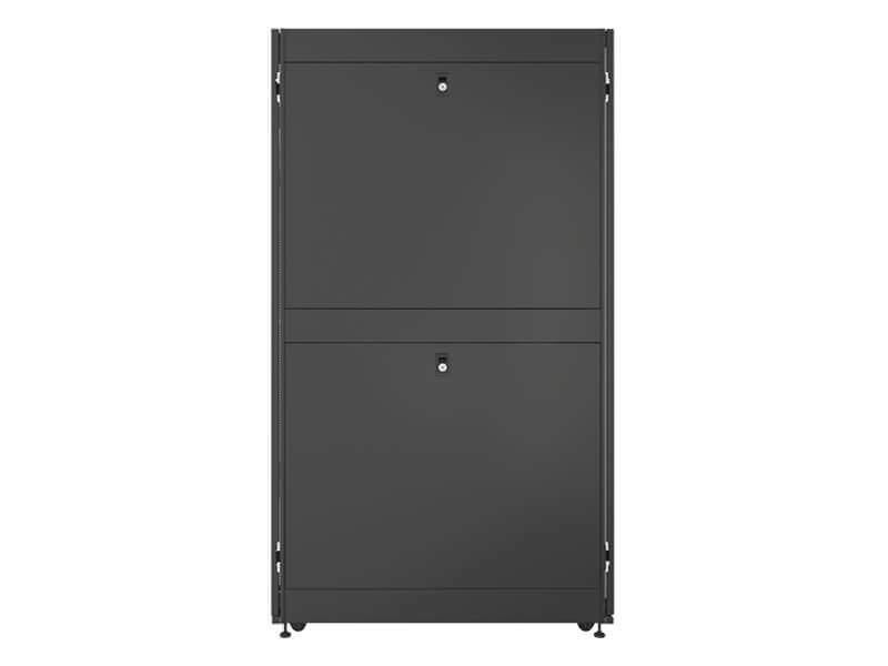All Vertiv™ VR racks come complete with keys and a hardware kit that includes 50 M6 cage nuts and screws, a cage nut installation tool, edge protection for top panel cable entry, a T30 / Phillips L key and T30 extension driver. All models feature a single 77% perforated locking front door, split 77% perforated locking rear doors, two pairs of split locking side panels, a high-density cable entry top cover (2000 Cat 6 cables), two sets of 19” EIA rails and two full height rack PDU Mounting /cable management brackets (one per side). The Vertiv™ VR Rack is built with low-profile casters and leveling feet, baying brackets and bolt-down brackets.