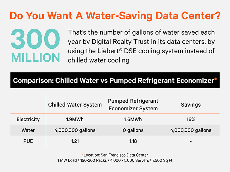 The Liebert® DSE in 265kW capacity is a free cooling economization system with backup DX compressor, which achieves the high efficiency without using water. The system can achieve an annual operational PUE under 1.2., while eliminating water usage, cost and treatment. Its large condenser surface area minimizes operating and peak power to minimize generator backup or free up additional saleable IT power. Unlike heat wheels, it has no air leakage or volumetric displacement, eliminating the need for additional fan power or make-up air capacity. As a self-contained solution, Liebert® DSE system is highly scalable for fast deployment and time to market. The Liebert® DSE 265kW is comprised of a packaged pumped refrigerant economizer and a micro-channel condenser, plus an indoor CRAC unit. The system operates in free cooling or partial free cooling mode, depending upon outdoor temperatures. When criteria for economization are met, the compressors turn off and the refrigerant pump turns on to move the refrigerant through the system to reject the heat of the data center, using only a fraction of the power of a compressor. Automated economization, controlled by the advanced Liebert® iCOM™ control, maximizes the number of free cooling hours by enabling economization whenever conditions warrant, including evening and night-time hours. It also eliminates the use of water. The Liebert® DSE system was recently approved by the State of California as a prescriptive option for economization under Title 24. Additionally, the system protects against outside air contamination and reduces system wear and tear by eliminating air dampers and louvers. Air-cooled free-cooling system with water-free economization, a rapidly deployable configuration and advanced Liebert® iCOM™ thermal controls to optimize each unit and harmonize the operation of multiple units for temperature and airflow.