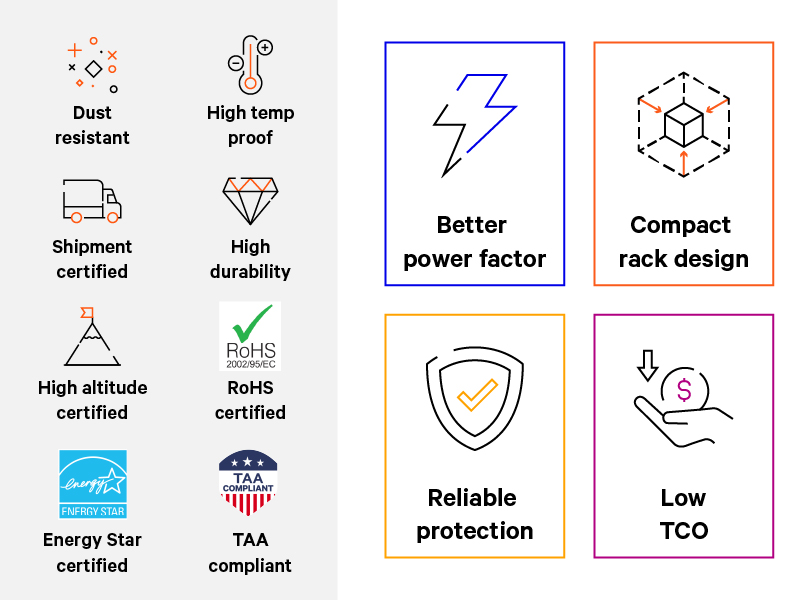 • Save space, footprint • Reliable power protection to protect critical systems (stabilizes bad power) • Maximizes rated power output • Extended battery life • Extended backup times available • Low operating costs • Low capital costs • Flexible distribution, mix and match to power a variety of loads • Easy to use, minimizes human error • Local and remote monitoring provides greater visibility • Reduces installation time • Vertiv Services improves uptime while reducing demands on the customer's staff