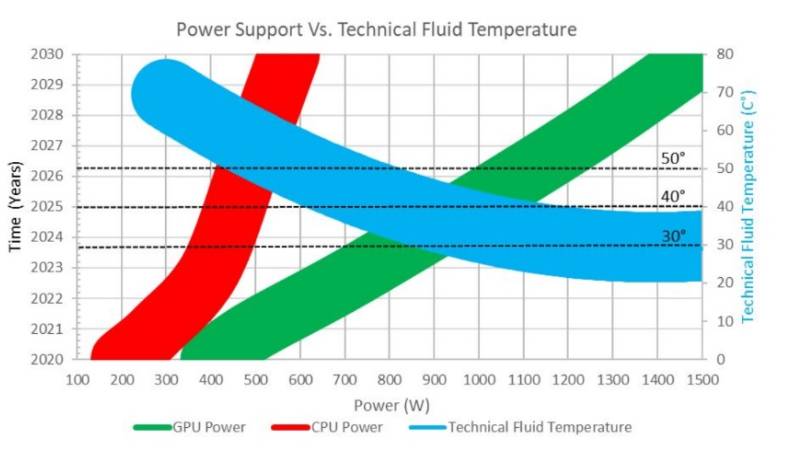 Figure 2. GPU and CPU power trends and associated technical fluid temperature requirements at 1.5 lpm per 1KW. Source: Open Compute Project®, “Coolant Temperatures for Next Generation IT and Durable Data Center Designs” presentation, OCP Regional Summit, April 2023