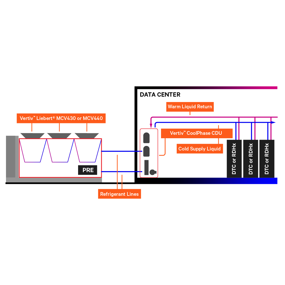 The Vertiv™ CoolPhase CDU removes the traditional barriers of needing a centralized chiller to deploy direct-to-chip liquid cooling. It gives you a cost effective, flexible means for deploying high density racks where you need them to support advanced applications. It has a compact footprint, modular format, and up to 320 kW of heat rejection. Using Pumped Refrigerant Economization (PRE) in the primary loop to the Vertiv™ Liebert® MCV high density condenser, the CoolPhase CDU removes heat from the secondary fluid network (SFN) in an internal liquid-to-refrigerant heat exchanger. This internal heat exchanger design chills the fluid in the SFN to optimal temperatures to deliver high-density cooling to direct-to-chip cold plates or to rear door heat exchanger (RDHx) such as Vertiv™ Liebert® DCD. The CoolPhase CDU PRE heat rejection takes advantage of seasonal conditions to adjust the level of economization, delivering increased cost savings throughout the year.