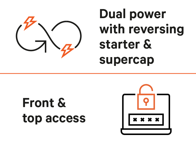 Dual power with reversing starter and supercap for additional redundancy and quick start/restart