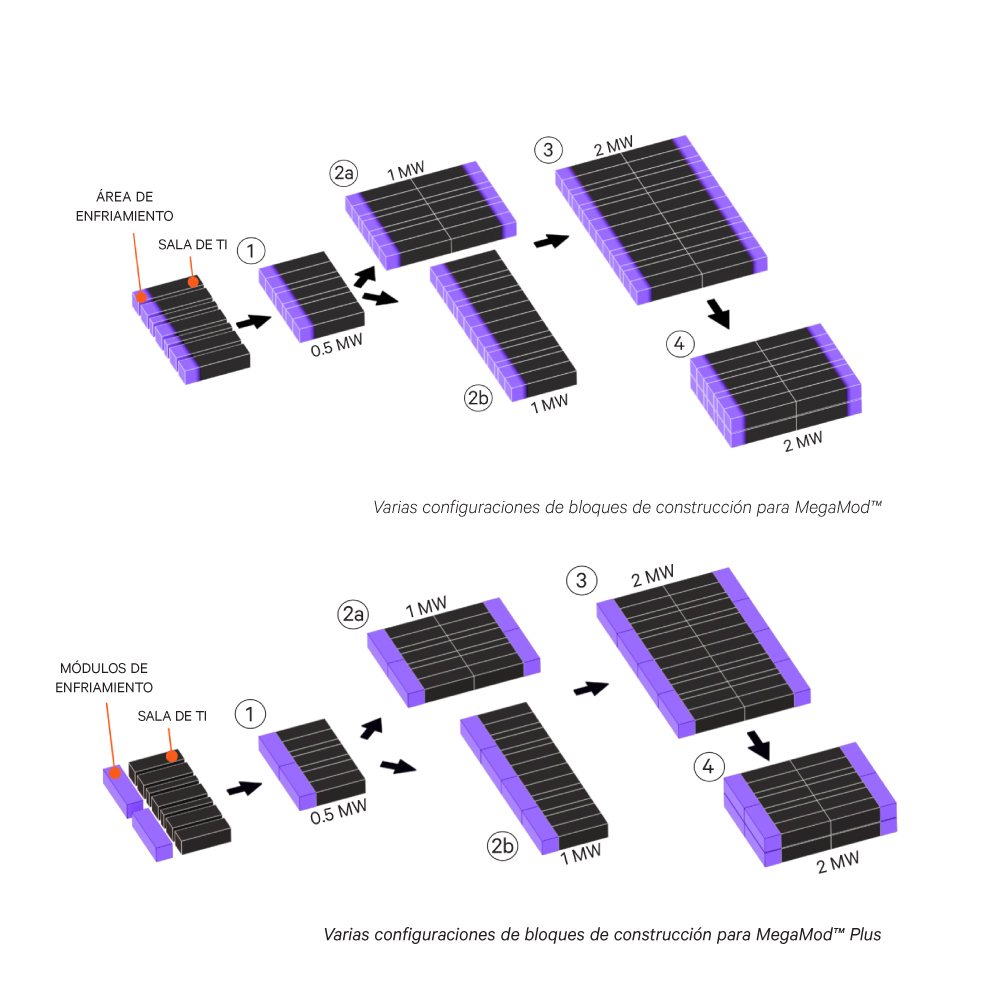 Vertiv MegaMod™ is a complete flexible, scalable data center solution starting from 0.5MW and easily expandable in units of 0.5 MW or 1 MW. The basic building block can further be multiplied in any of the three directions to create larger data centers. MegaMod™ provides everything you need to get started with a fully equipped modular data center, from external power rooms, to cooling, racks, monitoring and fire protection.