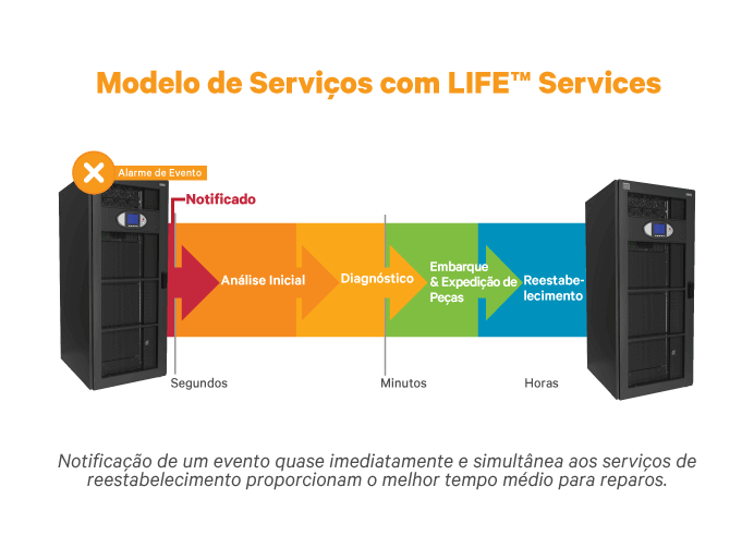 Minutos são relevantes quando os sistemas de missão crítica param de funcionar, mas mesmo tomar conhecimento que há um problema pode demorar horas se não houver uma vigilância constante. Os serviços LIFE™ proporcionam visibilidade de seus sistemas críticos em tempo real, resultando na rápida detecção de anomalias e na reação imediata em caso de alarmes. A capacidade de diagnóstico dos engenheiros de sistema remotos permite que nossos técnicos estejam rapidamente preparados para